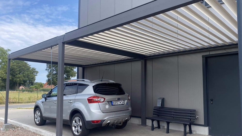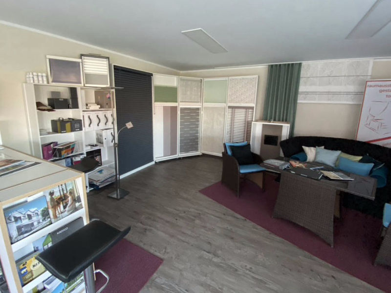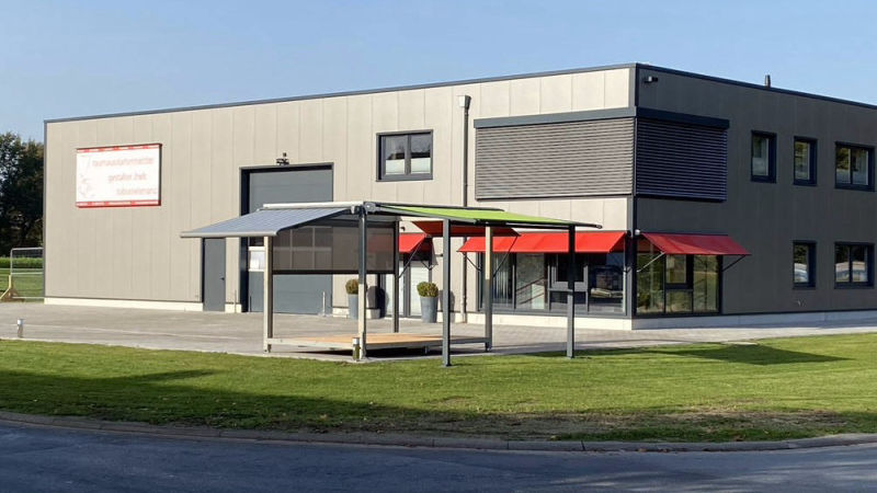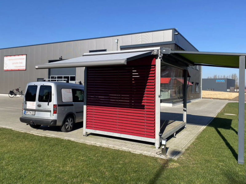 Auf dem Außengelände steht ein Musterständer für Markisen und Raffstores und Lamellendächer, der auch außerhalb der Geschäftszeiten zugänglich ist.